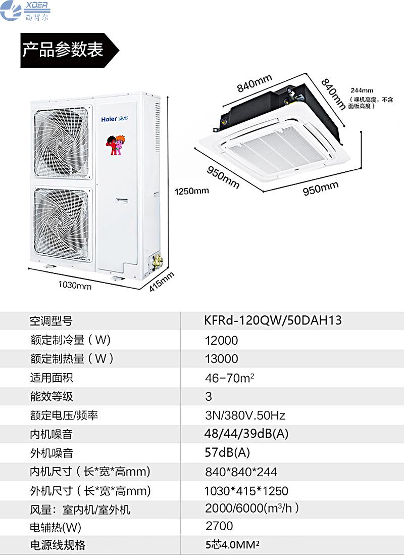 品牌:海爾(Haier) 型號: KFRd-125QW/21DAH13 產(chǎn)品類(lèi)型:天花機 國產(chǎn)/進(jìn)口:國產(chǎn) 整機質(zhì)保年限:6年 匹數:5匹 變頻/定頻:定頻 冷暖類(lèi)型:冷暖電輔 適用面積:70㎡以下 控制方式:遙控式 國家能效等級:新1級 電輔加熱:支持 電輔加熱功率:2700瓦 室內機噪音:44-40-37分貝 室外機噪音:56分貝 功率:4300瓦特 電源電壓:380伏特 內機重量:36千克 外機重量:102千克 內機尺寸(寬×高×深):840×840×244毫米 外機尺寸(寬×高×深):960×415×1250毫米 最大配管長(cháng)度(米):50米 內外機最大落差(米):30米 制冷劑:氟利昂R22
